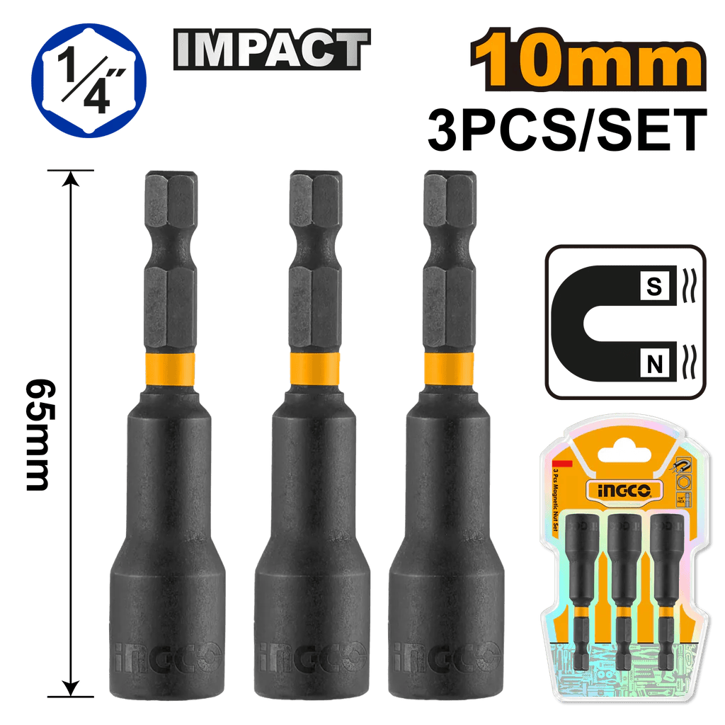 10mm, ensemble de 3 pièces Queue : Hexagonale 1/4″ Longueur : 65mm Matériau : 50BV30 Avec aimant puissant Emballé sous double blister