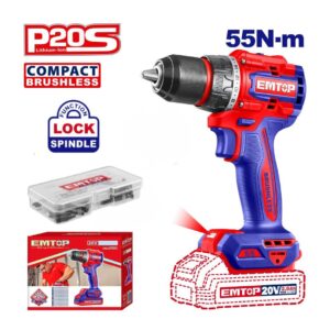 La perceuse à percussion sans fil EMTOP ECIDL206681 est une perceuse‑visseuse brushless (moteur sans balais) 20 V polyvalente conçue pour percer, visser et perforer différents matériaux. Elle combine puissance, autonomie et confort d’utilisation grâce à un couple maximal de 66 Nm, un mandrin métallique de 13 mm et deux vitesses mécaniques. Équipée d’un éclairage LED intégré, elle permet de travailler même dans les zones peu éclairées. Ce modèle est généralement vendu sans batterie ni chargeur (vendus séparément).