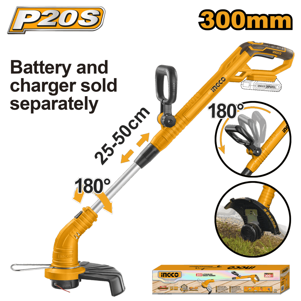 Débroussailleuse sans fil 20 V, moteur à balais, vitesse à vide 8200 tr/min, diamètre de coupe 300 mm, ligne de coupe 1,6 mm, longueur de ligne 5 m, fonction de bordure, batterie et chargeur vendus séparément.